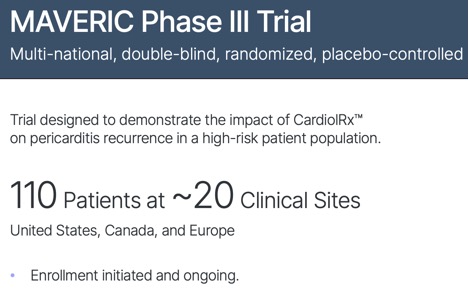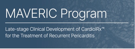 MAVERIC is a Phase III, multi-center, randomized, double-blind, placebo-controlled trial designed to enroll 110 patients with recurrent pericarditis at approximately 20 clinical sites across the United States, Canada, and Europe. Patients who have been treated with an interleukin-1 (“IL-1”) blocker for at least 12 months and are scheduled to have this treatment discontinued, will be randomly assigned to receive either CardiolRx™ or placebo following cessation of the IL-1 blocker. Discontinuation of IL-1 blocker therapy is associated with a high risk for recurrence and has been reported to occur within 12 weeks in up to 75% of patients. The primary clinical objective of the trial will be to assess the impact of CardiolRx™ versus placebo on freedom from a new episode of recurrent pericarditis at 24 weeks. Other clinical endpoints include time to a new episode of pericarditis recurrence, and changes in patient-reported pericarditis chest pain score and changes to the inflammatory marker C-reactive protein.