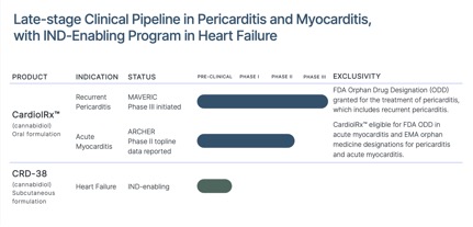 The MAVERIC Program in recurrent pericarditis, an inflammatory disease of the pericardium which is associated with symptoms including debilitating chest pain, shortness of breath, and fatigue, and results in physical limitations, reduced quality of life, emergency department visits, and hospitalizations, comprises the completed Phase II MAvERIC-Pilot study (NCT05494788) and the ongoing Phase III MAVERIC trial (NCT06708299). The completed ARCHER trial (NCT05180240) is a Phase II study in acute myocarditis, an important cause of acute and fulminant heart failure in young adults and a leading cause of sudden cardiac death in people less than 35 years of age. The US FDA has granted Orphan Drug Designation to CardiolRx™ for the treatment of pericarditis, which includes recurrent pericarditis.