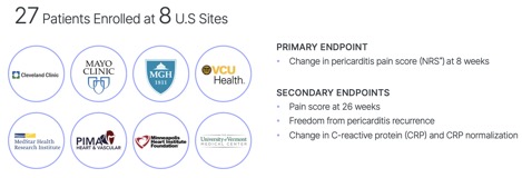 MAVERIC is currently being initiated at pre-eminent cardiovascular clinical research sites throughout the United States under an Investigational New Drug application authorized by the United States Food and Drug Administration (“US FDA”). The MAVERIC Program and Phase III leadership comprises an independent committee of international thought leaders in pericardial disease and clinical trial design: Allan Klein, MD, CM from Cleveland Clinic (MAVERIC Program Chair); Massimo Imazio, MD, FESC from University of Udine, Italy (MAVERIC Program Co-Chair); Paul Cremer, MD from Northwestern University (MAVERIC Trial Principal Investigator); Allen Luis, MBBS, PhD from Mayo Clinic Rochester (MAvERIC-Pilot Principal Investigator); Antonio Abbate, MD, PhD from University of Virginia; and, Stephen Nicholls, MBBS, PhD from Monash University, Melbourne, Australia.