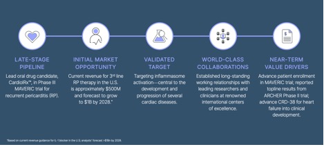 - CardiolRx™, which has been granted US FDA Orphan Drug Designation for this indication, is a small molecule oral drug targeting inflammasome pathway activation that is central to the development and progression of pericarditis.